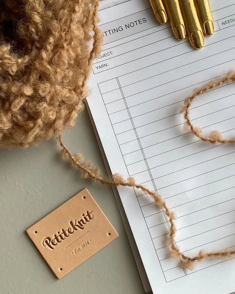 Læderlabel med teksten "PetiteKnit. Est. 2016"